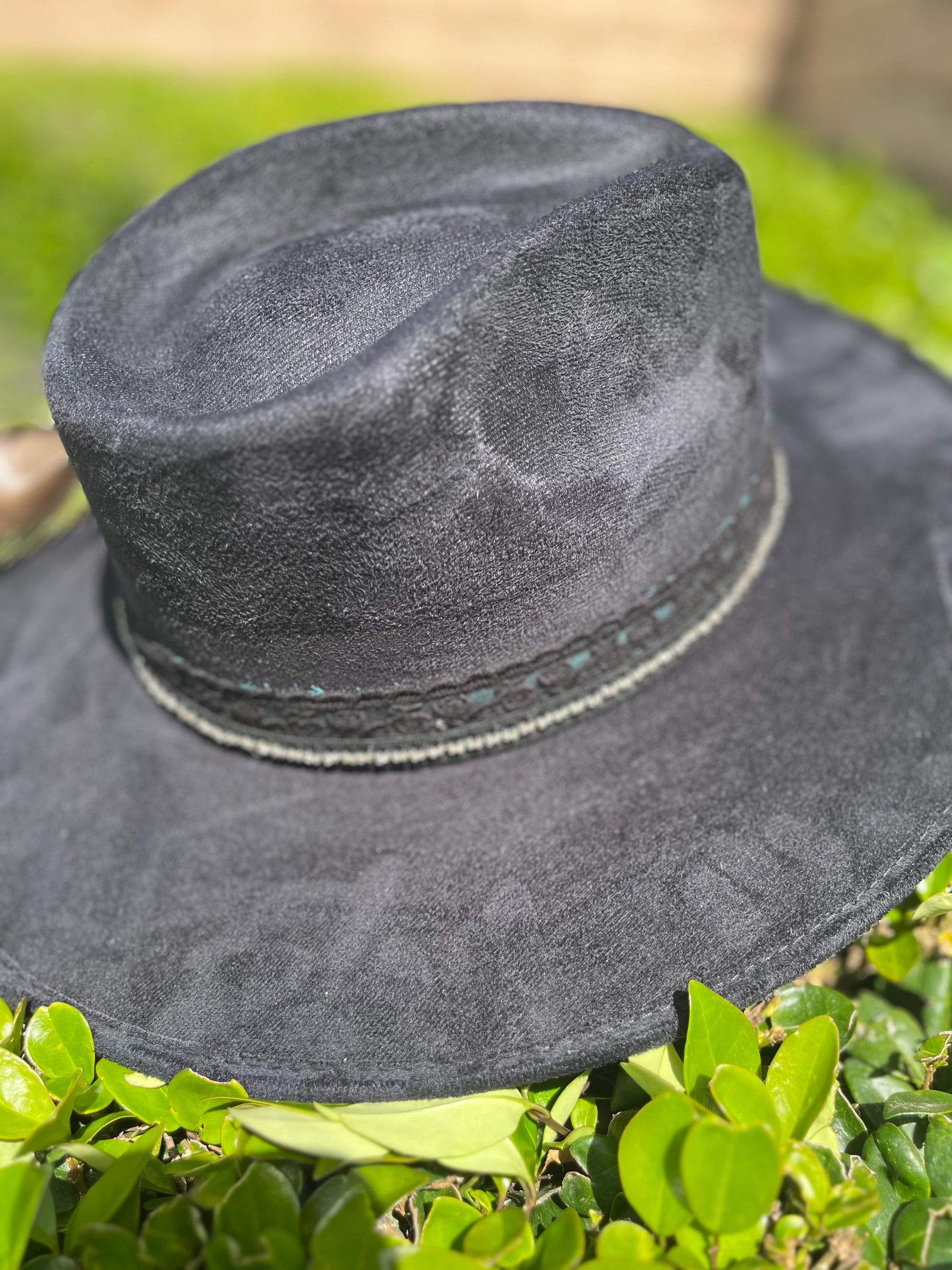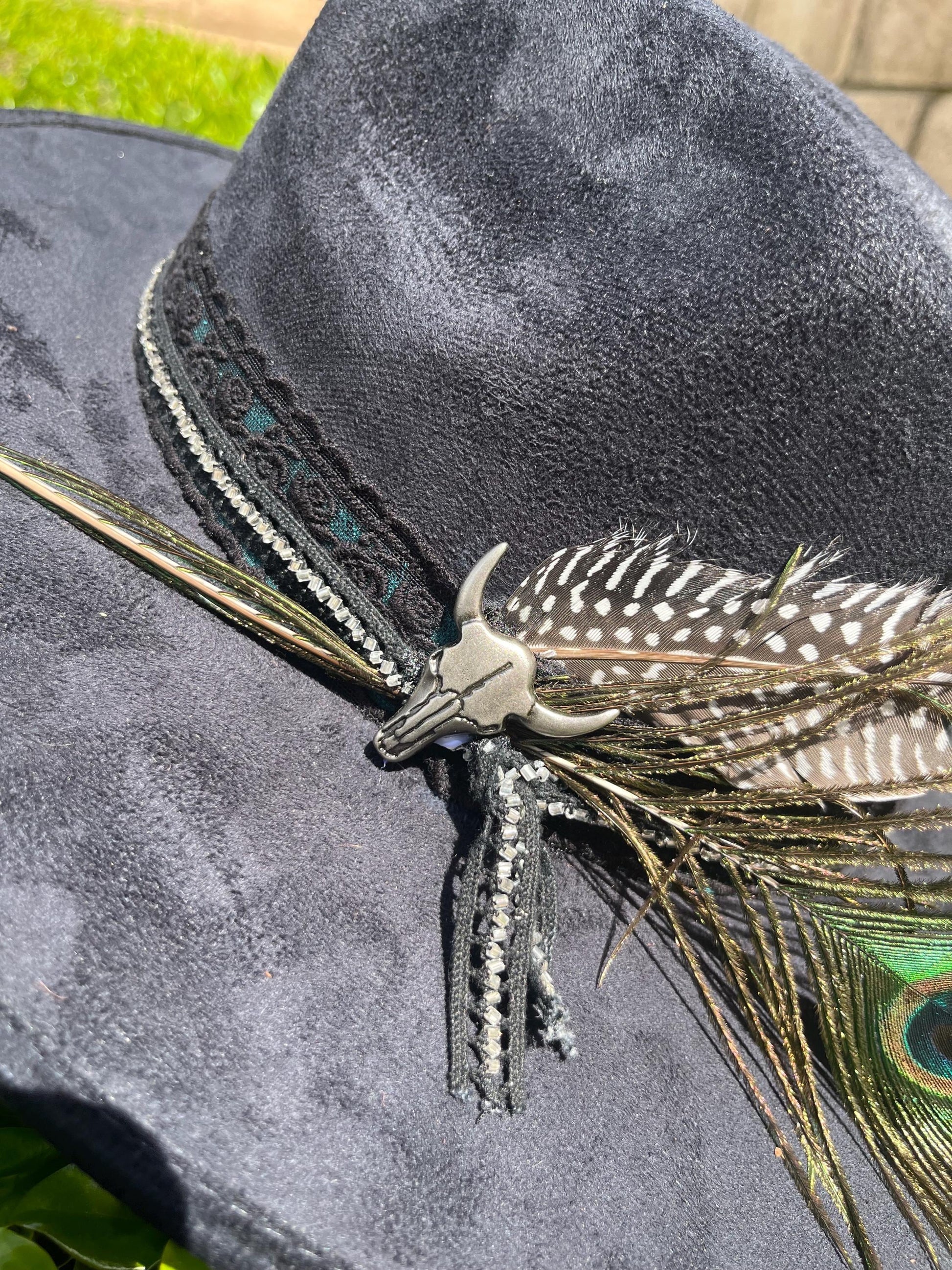 black suede flat brim western cowboy hat with lace and turquoise band with dainty rhinestone trim. this hat has a steer head charm with a beautiful peacock feather and black and white pheasant feather for detail