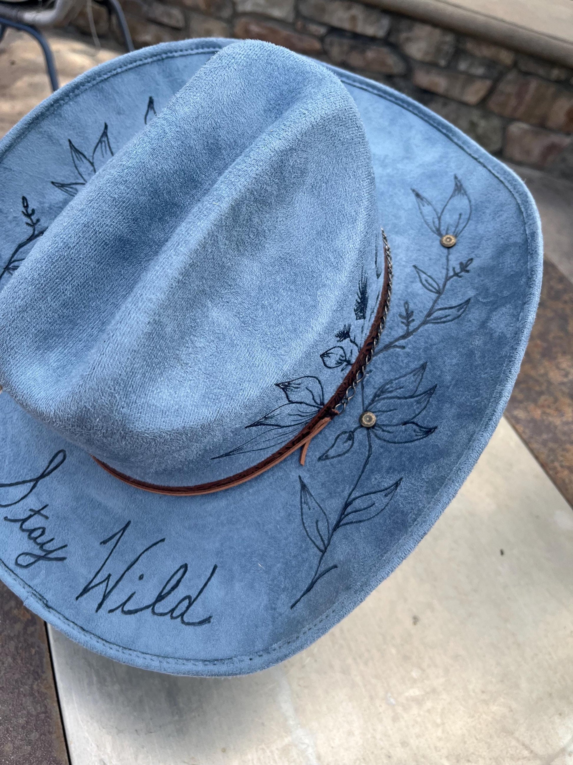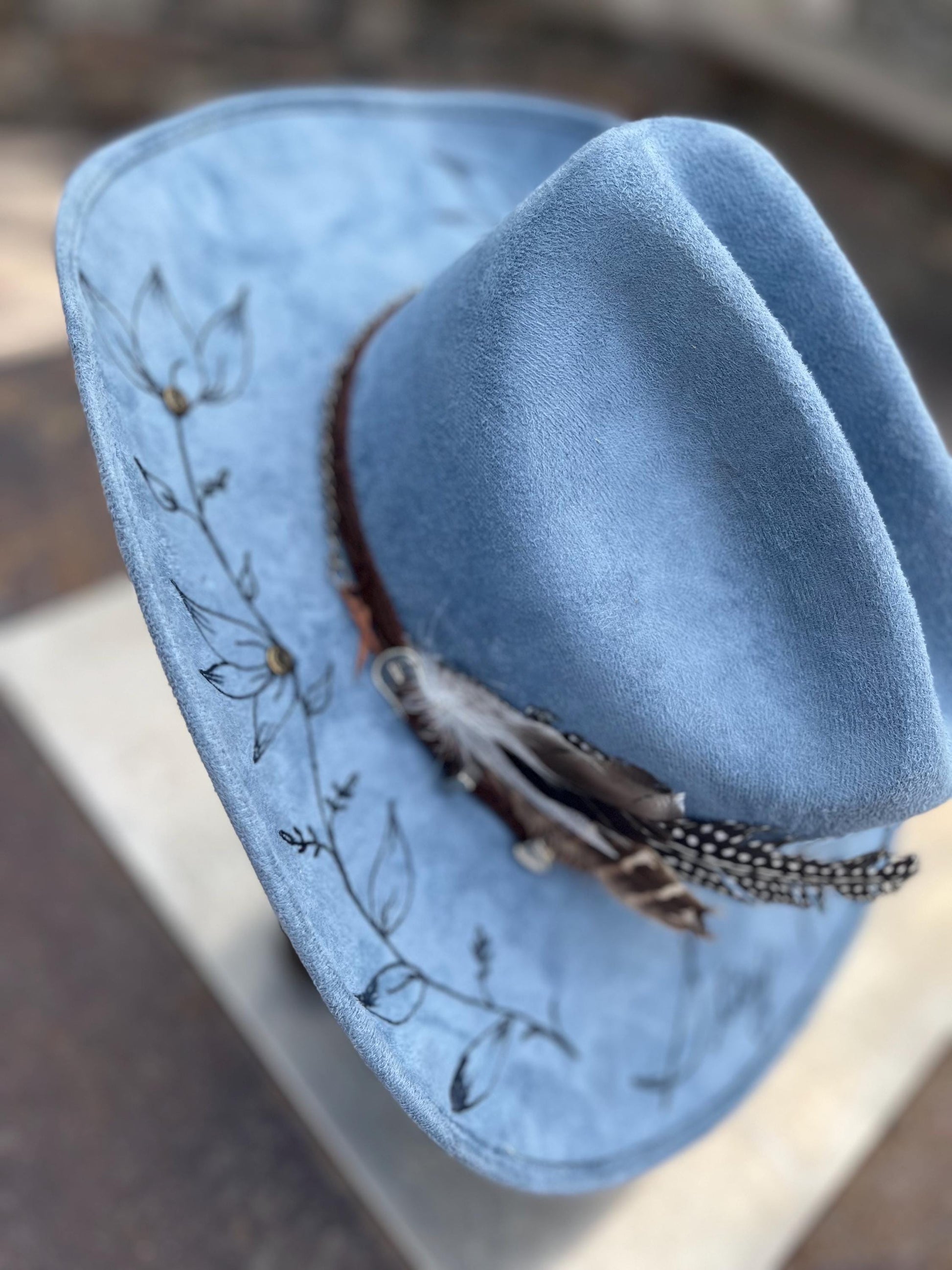 Denim blue western cowboy hat hand burned with flowers and rivets . Band is brown leather belt with metal chain accented with feathers.
